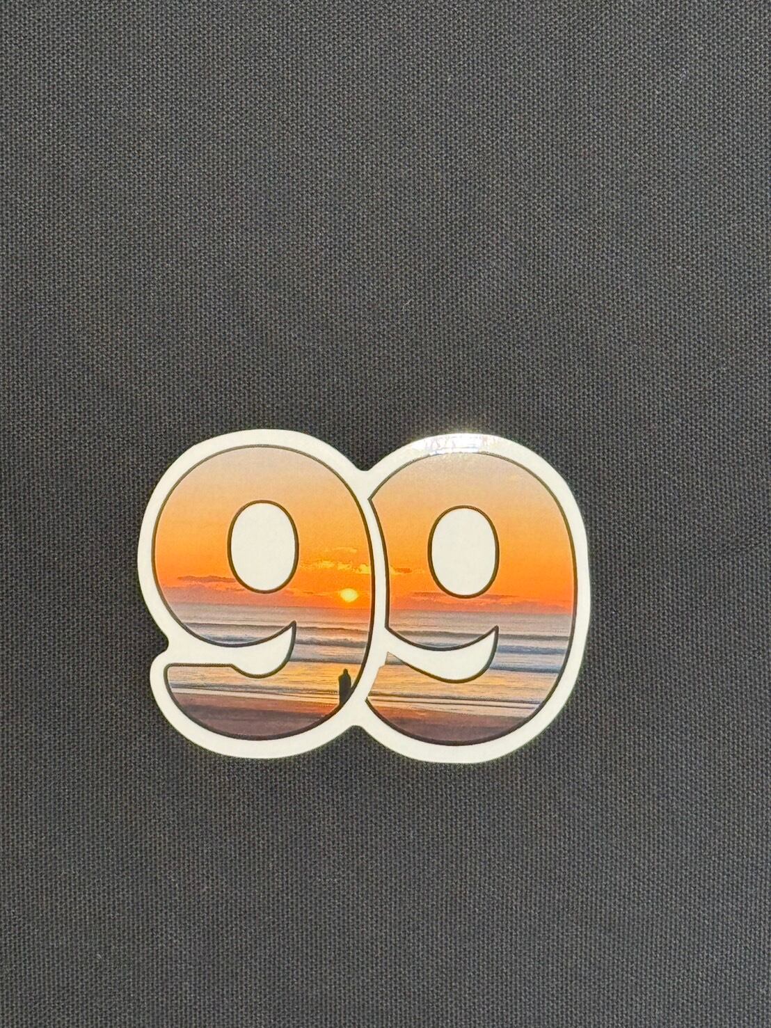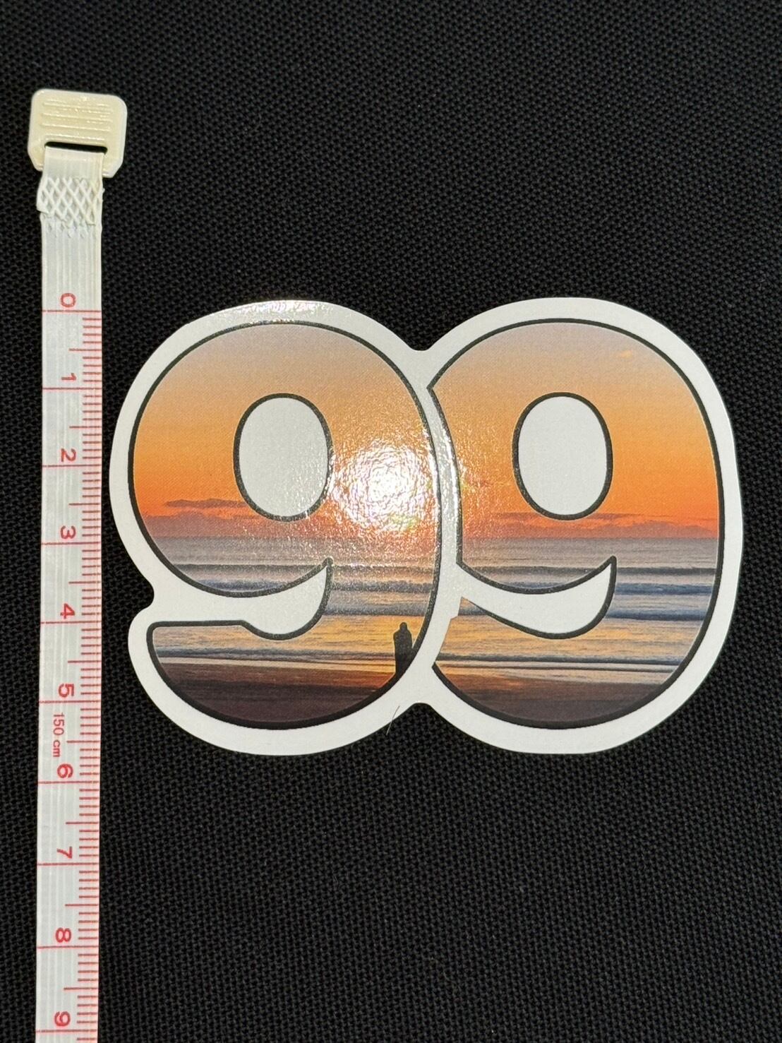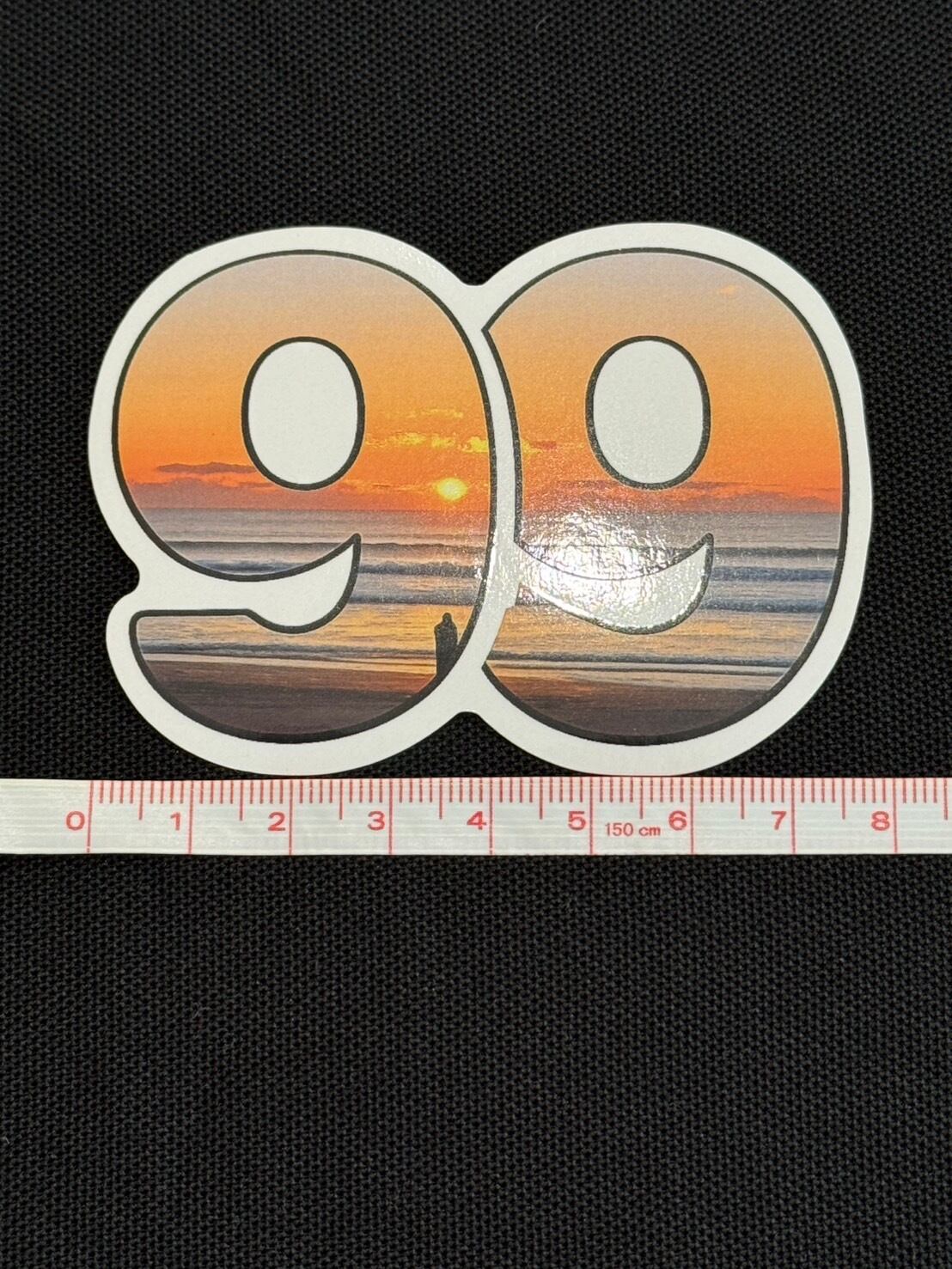 九十九里の日の出を配信しているゆきちゃんのバックショットを、九十九里を表す「99」に模ったステッカー。